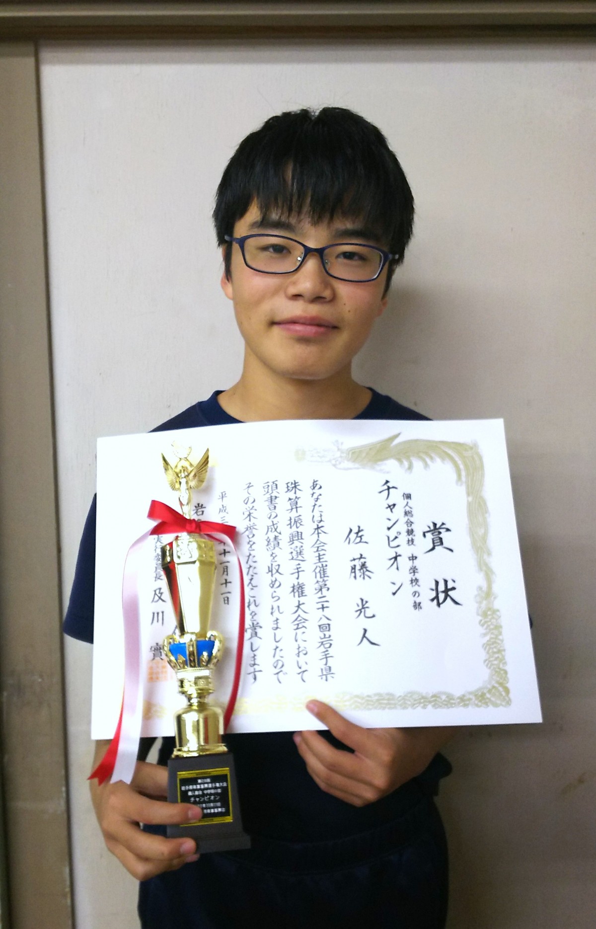 下は小学1年生から一般の方まで幅広い年代での188名で行われ、第一珠算生も49名参加してまいりました。「小学校3年生以下の部」、「小学校4・5・6年の部」、「中学校の部」、「高等学校の部」、「一般の部」の5部門に分かれての競技でしたが、団体総合の部では第一珠算学校チームは「小学校4・5・6年生の部」「中学校の部」の2部門において団体優勝に輝くことができました。個人の部においては、個人総合中学校の部で佐藤光人くん(江釣子中3)がチャンピオンに輝き、小学校4・5・6年生の部では山本優菜さん(江釣子小6)が昨年に続き個人の3部門で優勝し、「3冠王」に輝くという大活躍ぶりでした。