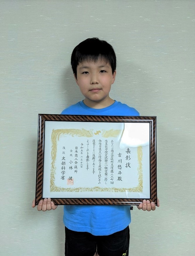 5月に行われた「岩手県名人位決定戦」において、フラッシュ暗算競技で小学校の部優勝など、各部門にて入賞されている実力の持ち主です。そして、悠斗さんのご家族は過去にお母さん、お兄さん、お姉さんも珠算1級満点合格の経験をされており、珠算一家でもあります。本当におめでとうございました!!