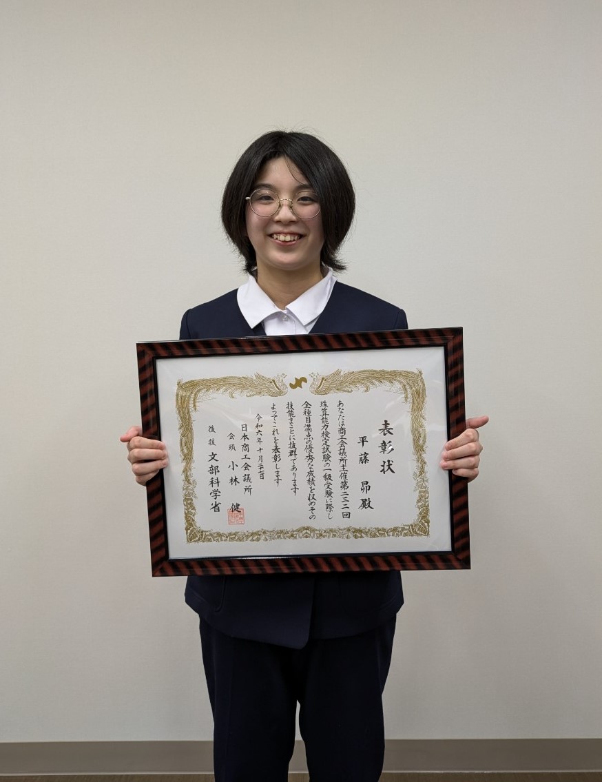 令和6年10月に行われた全国各地で施行されました【日本商工会議所主催 珠算能力検定試験】に於いて、第一珠算学校から新たに珠算1級満点合格者が1名誕生!!この度1月に北上商工会議所において表彰されましたので紹介させていただきます。
